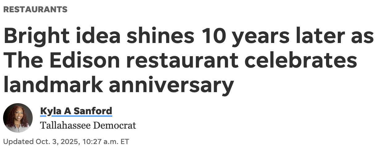 We hope that your visit to The Edison Restaurant is a return visit and if it’s your first time please ask for a manager so that we can thank you for joining us. It is our pleasure to show and share all of the great bounty that Florida, Tallahassee, and Cascades Park has given us.