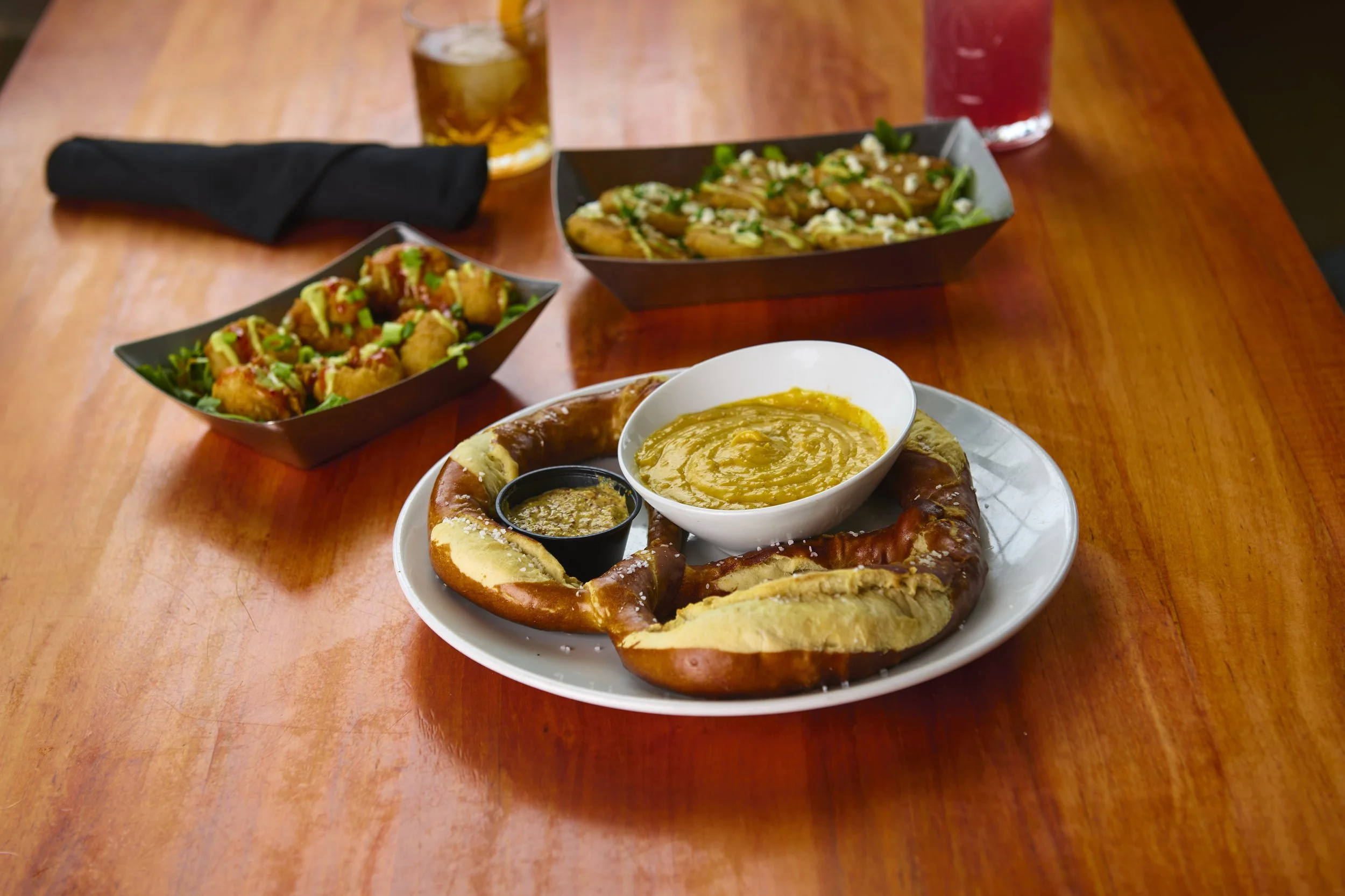 Brushed with butter, lightly salted, and served with ground mustard and house beer cheese, this pretzel is a table favorite—especially for groups, happy hour, or casual nights that turn into full dinners.